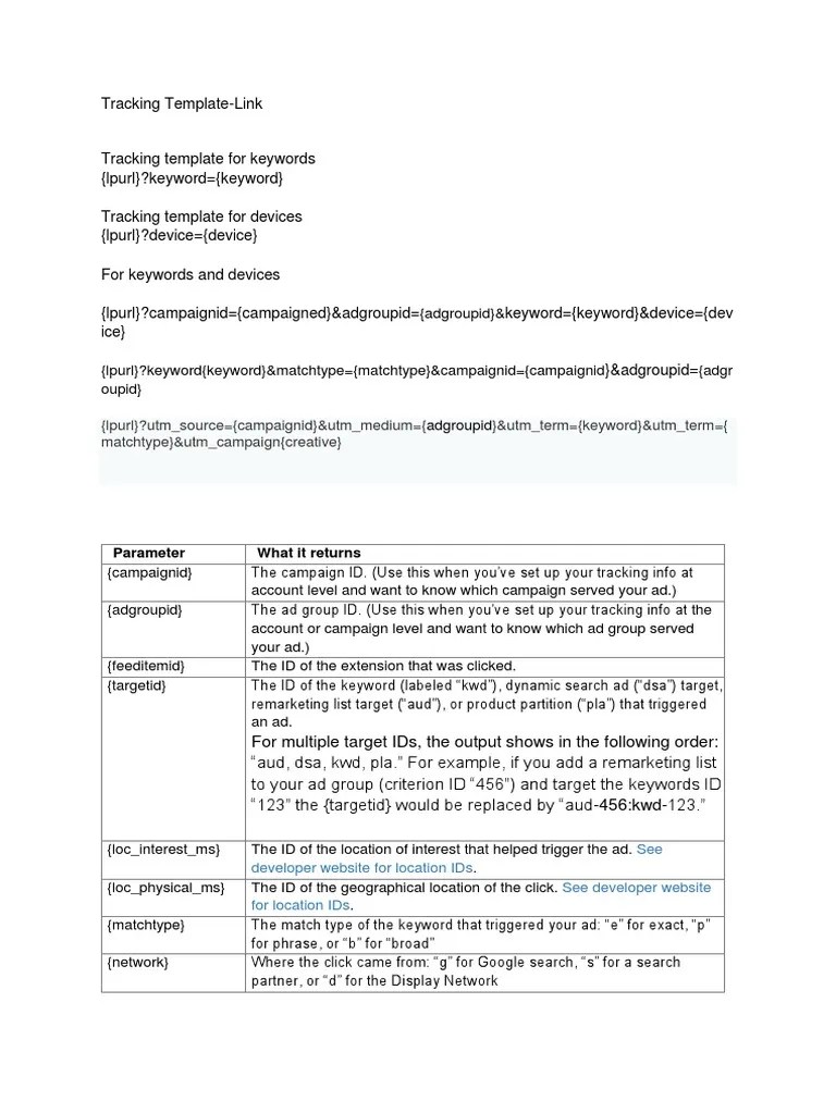 Understanding what a tracking template is. When your ad is clicked, these parameters. When an ad is clicked, the information is used to create your. The keyword tracking template is the most specific followed by the ad, ad group, campaign, then account.